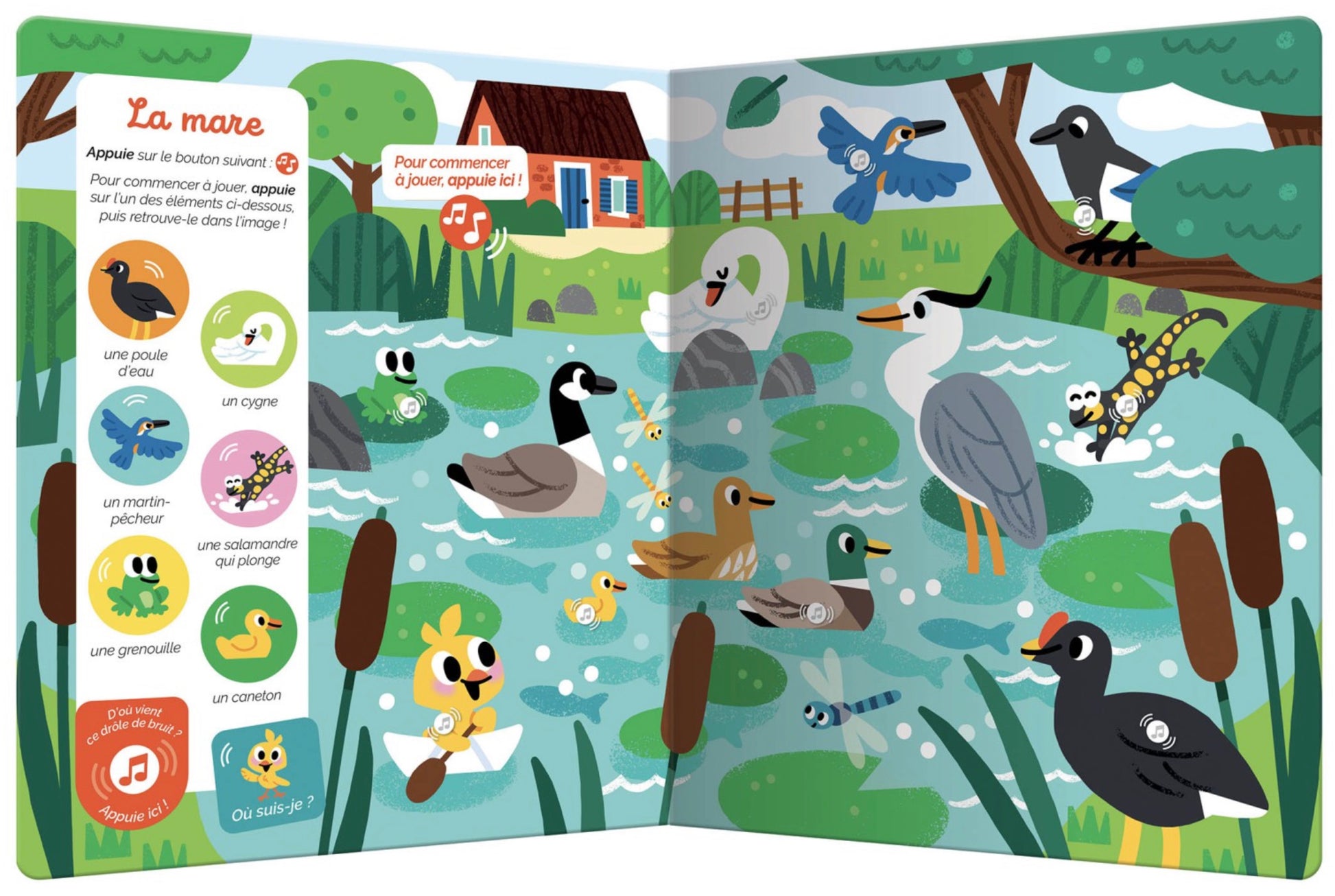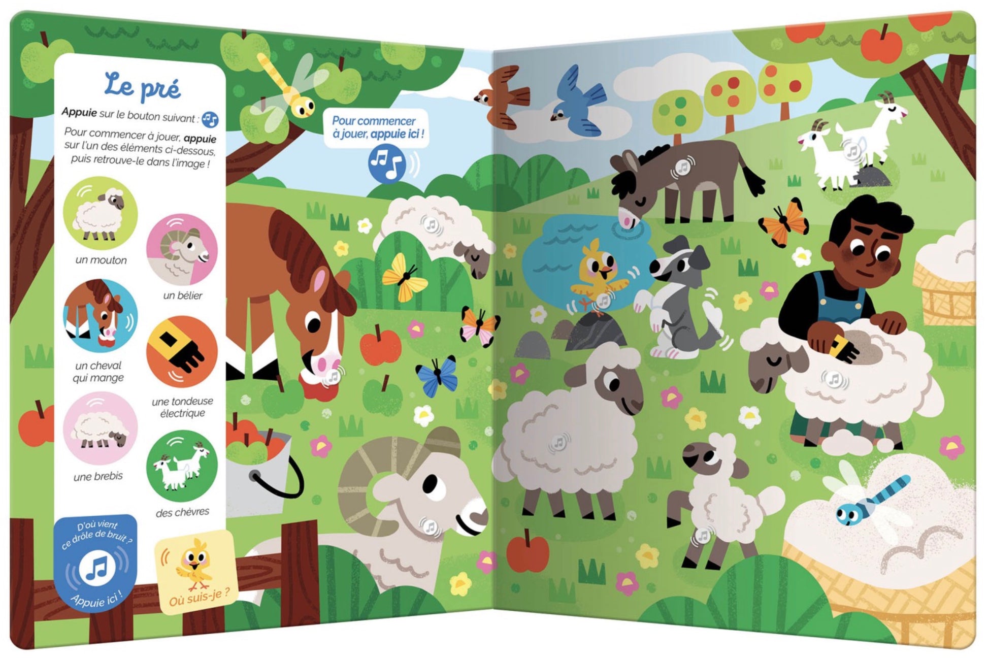 Sur chaque double-page, il observe et écoute attentivement pour retrouver 6 animaux et une mascotte qui se cache chacun des univers : la basse-cour, l'étable, le pré...