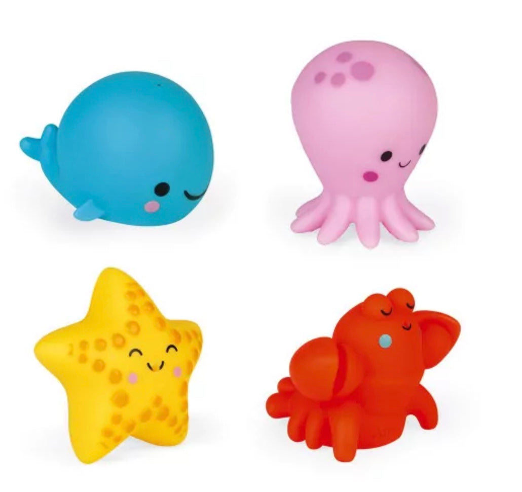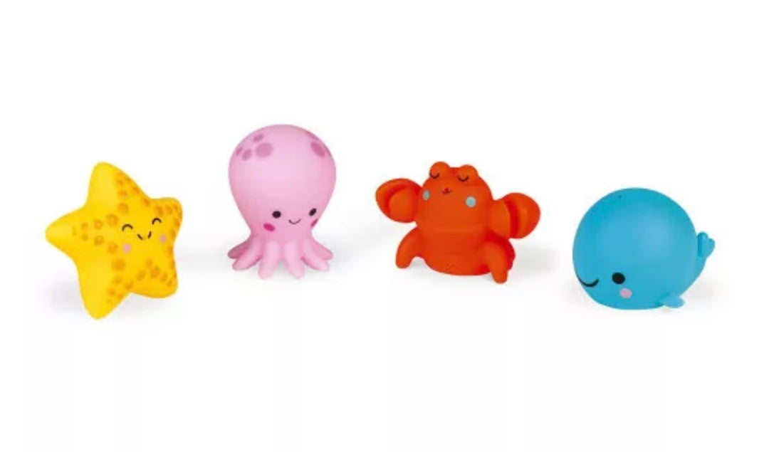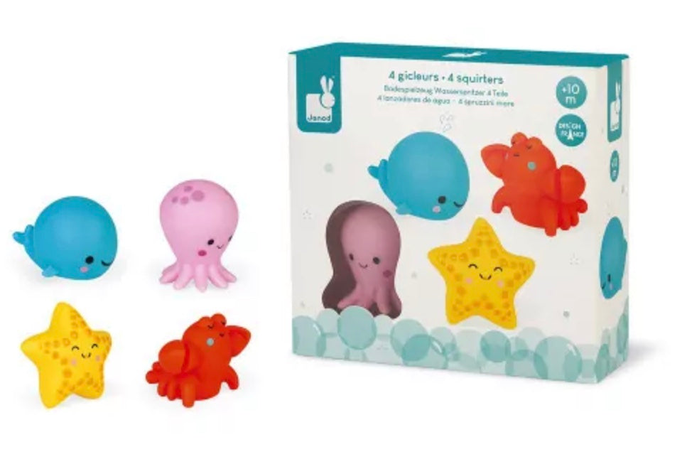 Votre enfant jouera dans son bain pendant des heures avec ces 4 animaux de la mer : une pieuvre, un homard, une étoile de mer, une baleine. Ils sont très faciles à prendre en main et en appuyant sur leur tête ou sur leur ventre ils cracheront de l’eau !