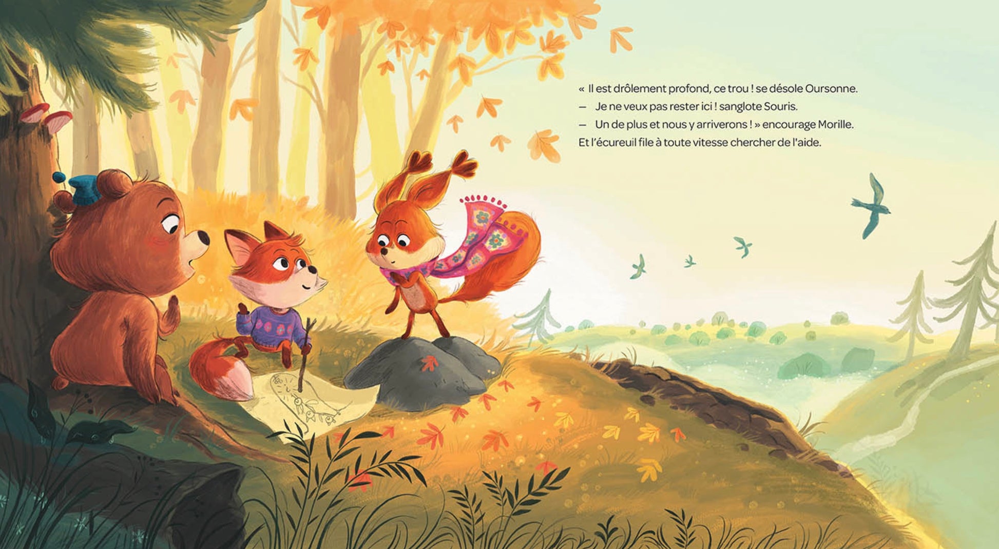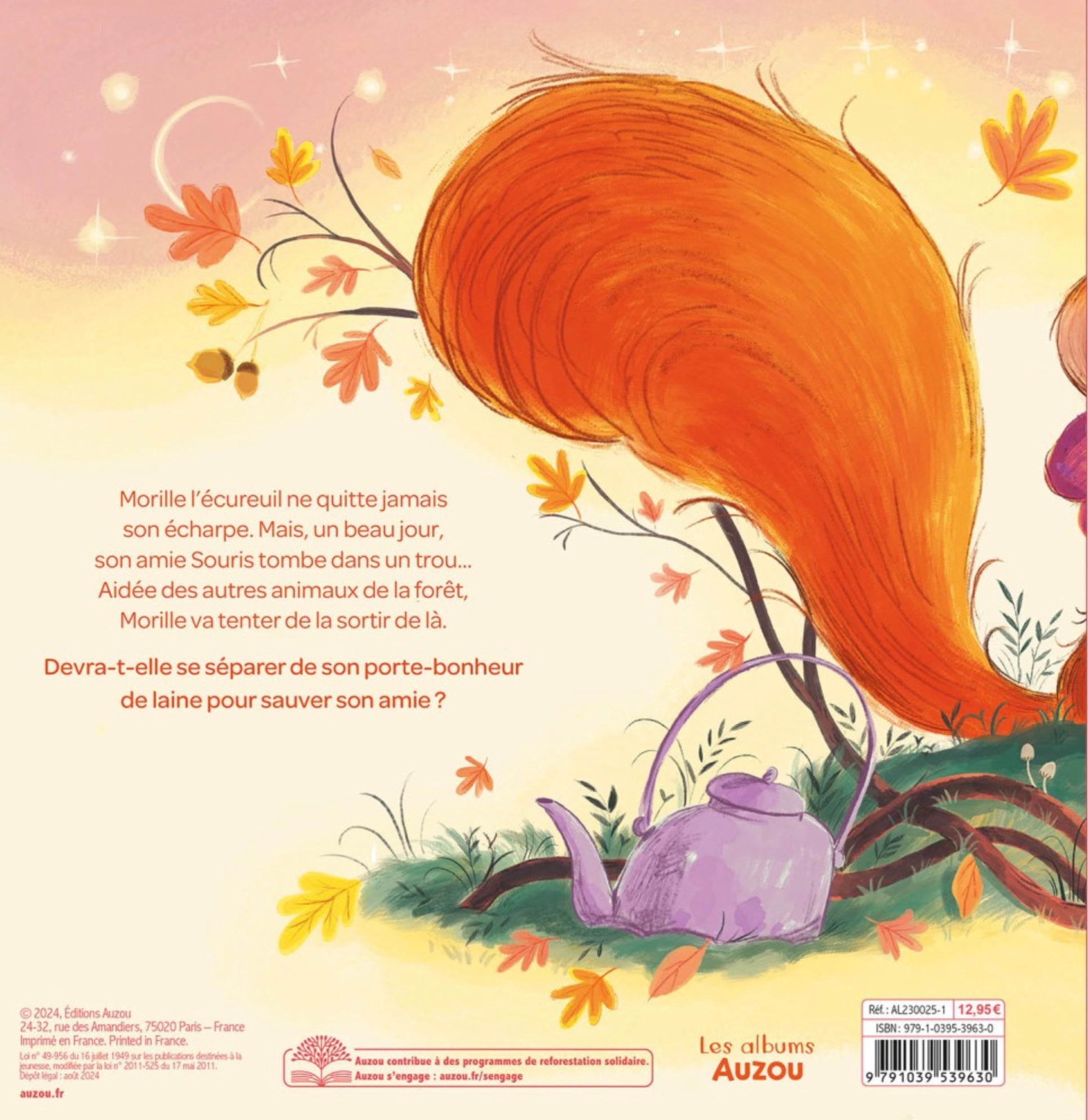 Morille l’écureuil ne quitte jamais son écharpe. Mais un beau jour, son amie Souris tombe dans un trou… Aidée des autres animaux de la forêt, Morille va tenter de la sortir de là. Devra-t-elle se séparer de son porte-bonheur de laine pour sauver son amie ?