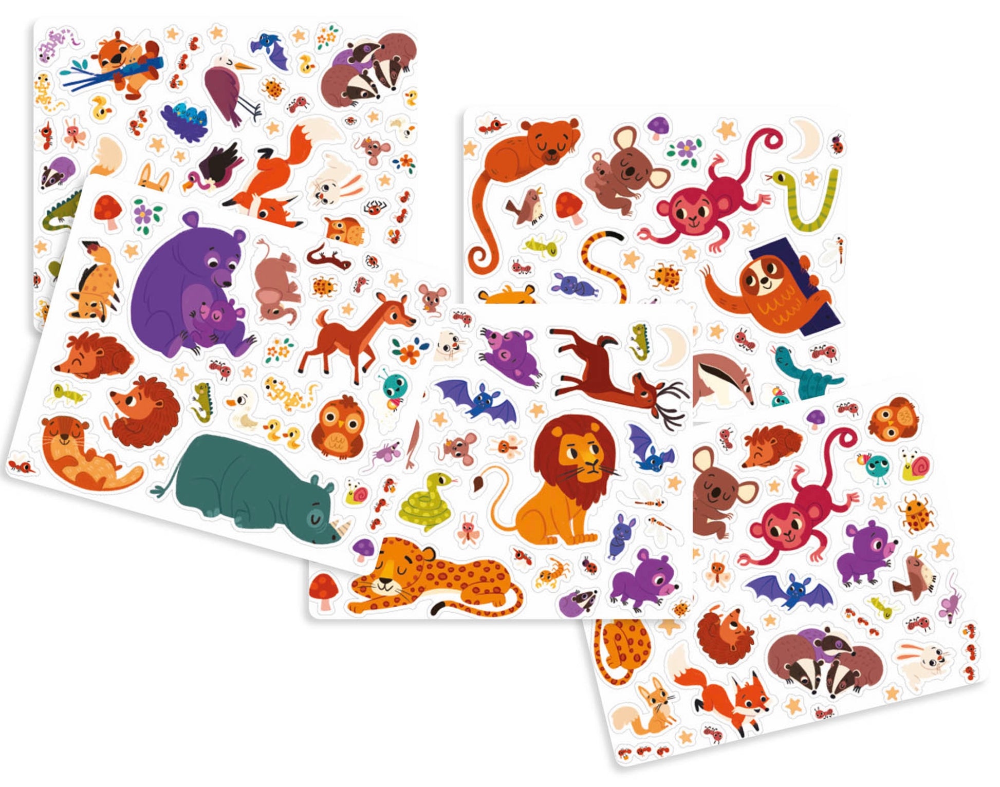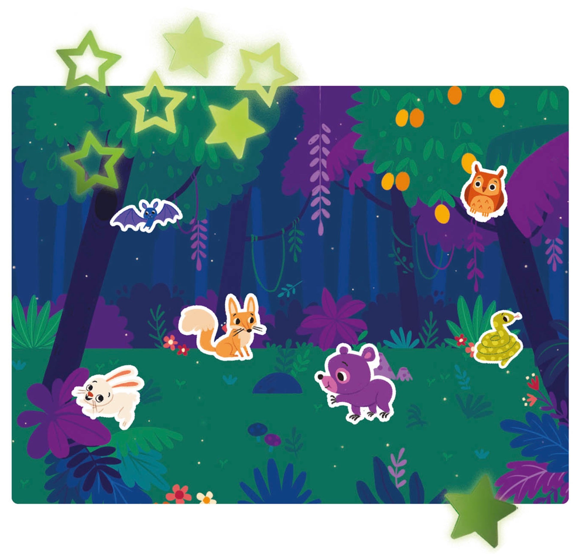 Découvre un magnifique poster de forêt à décorer avec 200 autocollants qui brillent dans le noir ! 8 étoiles et lunes à accrocher au plafond sont aussi incluses !