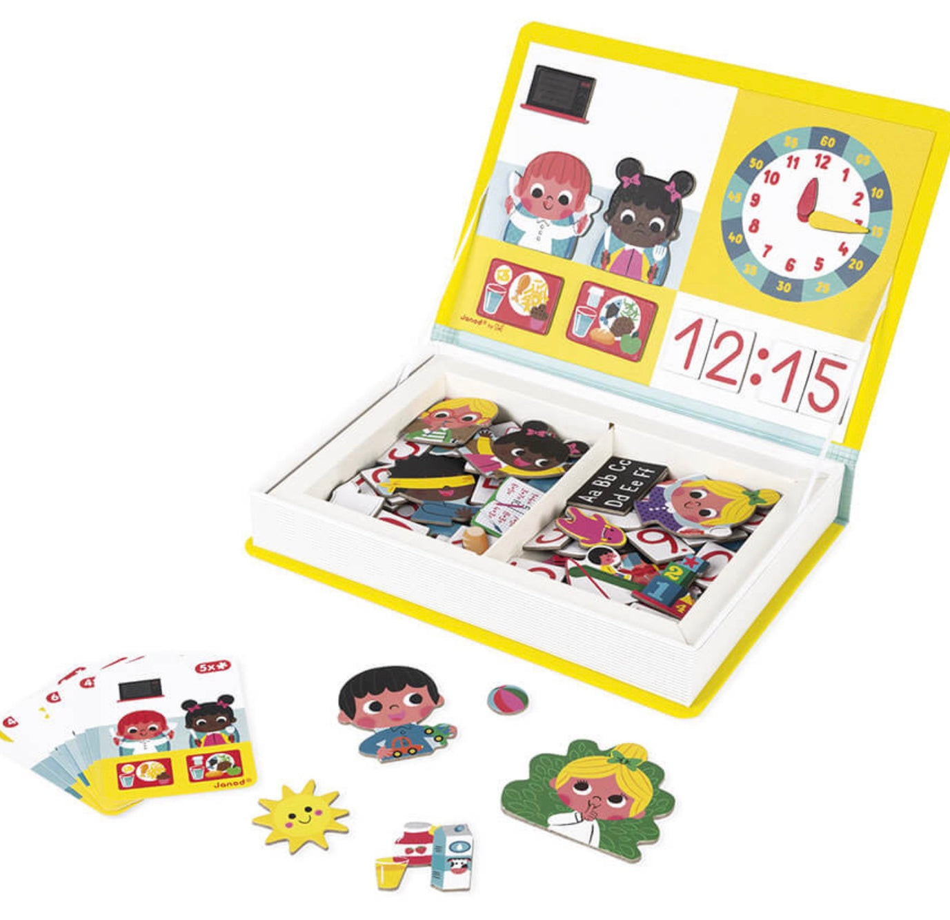 Découvrez les Magnéti'book : des jeux éducatifs et fun, faciles à manipuler et à transporter partout dès 3 ans ! Le principe est simple, recomposer la scène du quotidien indiquée sur la carte et y associer une heure. A quelle heure je prend mon petit déjeuner, quelle est l'heure de la sieste ... avec les 75 magnets et les 8 cartes modèles recto-verso incluses, 16 scènes de la vie quotidienne sont à reproduire ! Une fois le livre ouvert, l'enfant vient placer les magnets sur la face magnétique et ils restent en place : parfaits pour les longs trajets en voiture ou les attentes qui se prolongent. Les Magnéti'book ont un format malin qui permet de les transporter facilement, et de les ranger dans une bibliothèque comme un livre. De nombreux modèles sont disponibles, quel thème allez-vous ajouter à votre collection ? Ce produit est composé de matériaux certifiés FSC® et de matériaux contrôlés.
