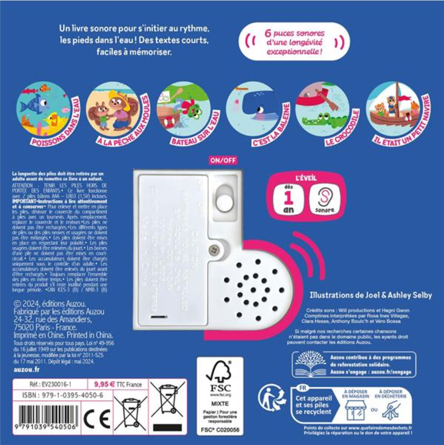 Des comptines courtes, faciles à mémoriser, chantées en crèche et en maternelle. L’ouvrage contient un bouton on/off (pour durer plus longtemps) et des piles AAA (faciles à changer) !