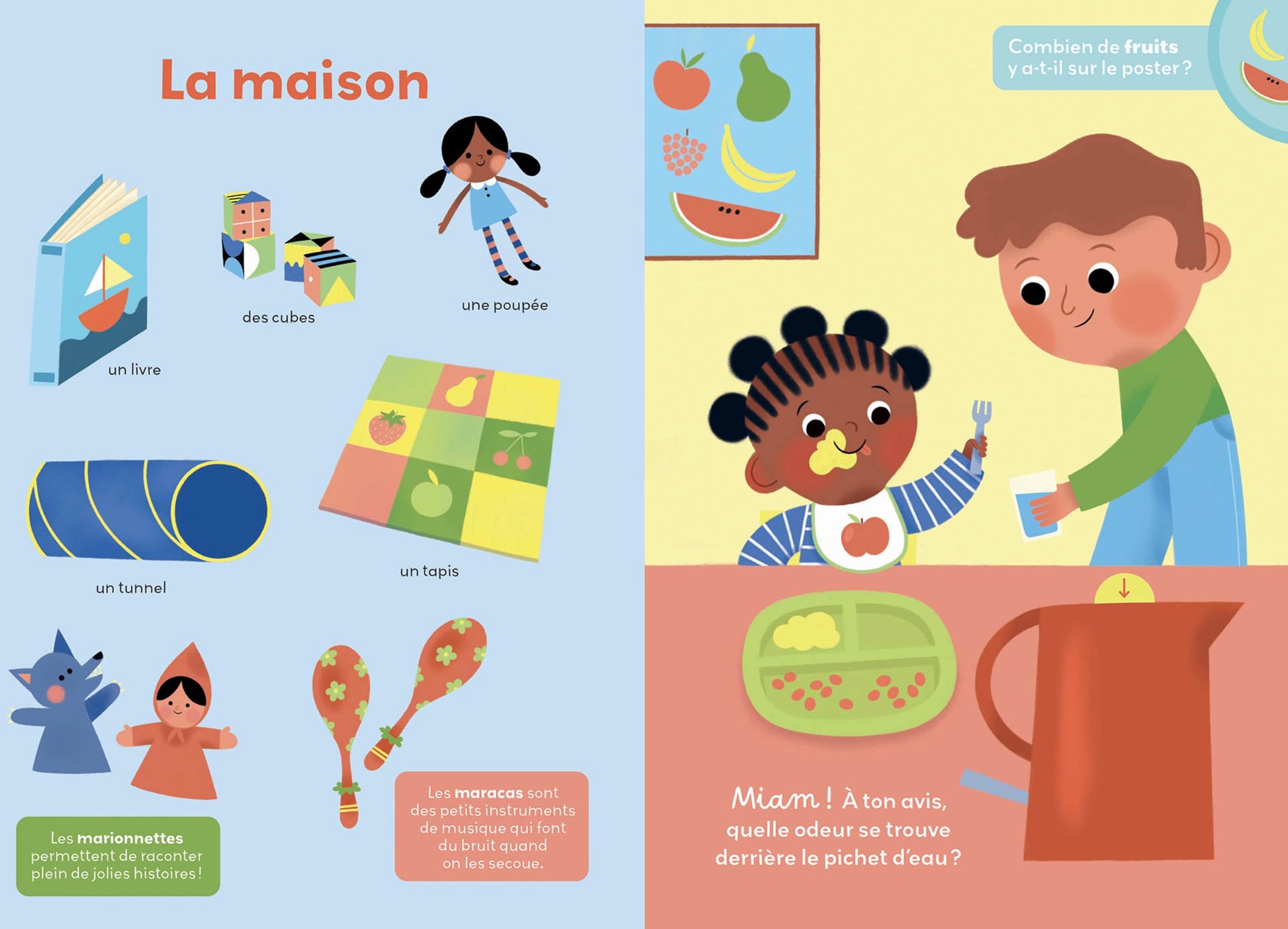 Sur chaque double-page, l'enfant pourra découvrir des informations étonnantes, jouer à compter des éléments (jusque 10) et entraîner sa motricité fine grâce à un grand flap qui cache une odeur amusante !