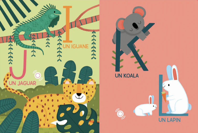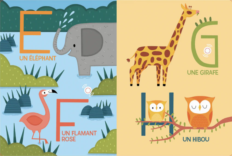 À chaque page, une puce sonore permet d’écouter la lettre et le nom de l’animal lus à voix haute. 26 sons à découvrir !