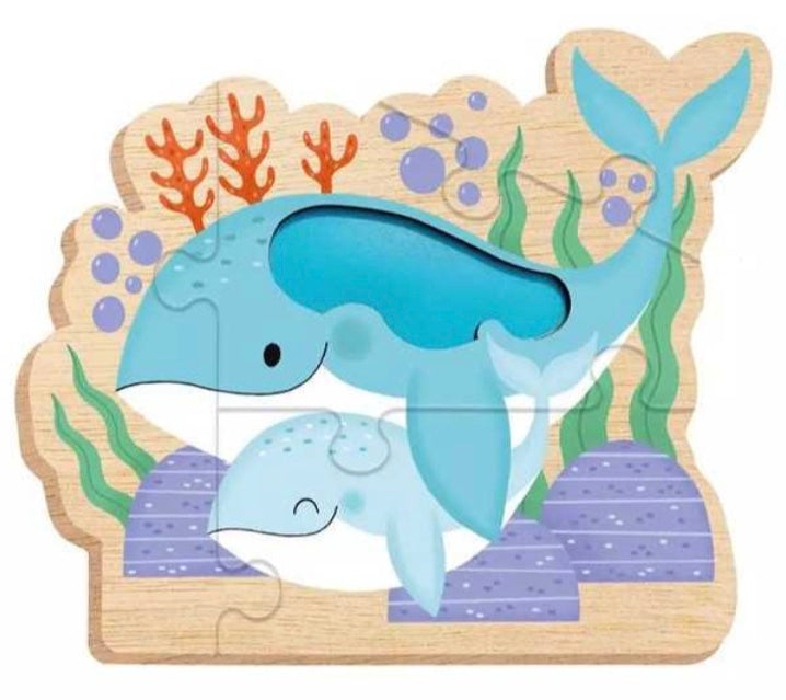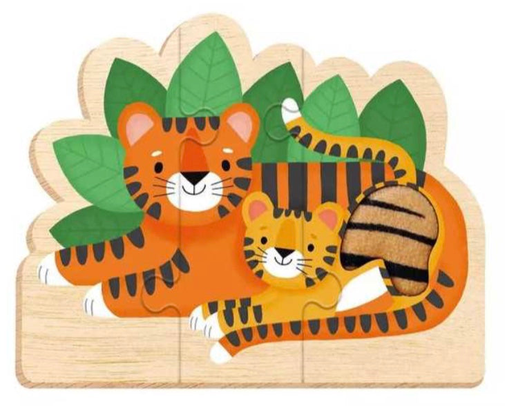 3 superbes puzzles évolutifs en bois et à toucher! Chaque puzzle est adapté à un niveau différent : un puzzle de 2 pièces, un puzzle de 3 pièces et un puzzle de 4 pièces. Une thématique maman et bébé avec le tigre, la baleine et le hérisson.