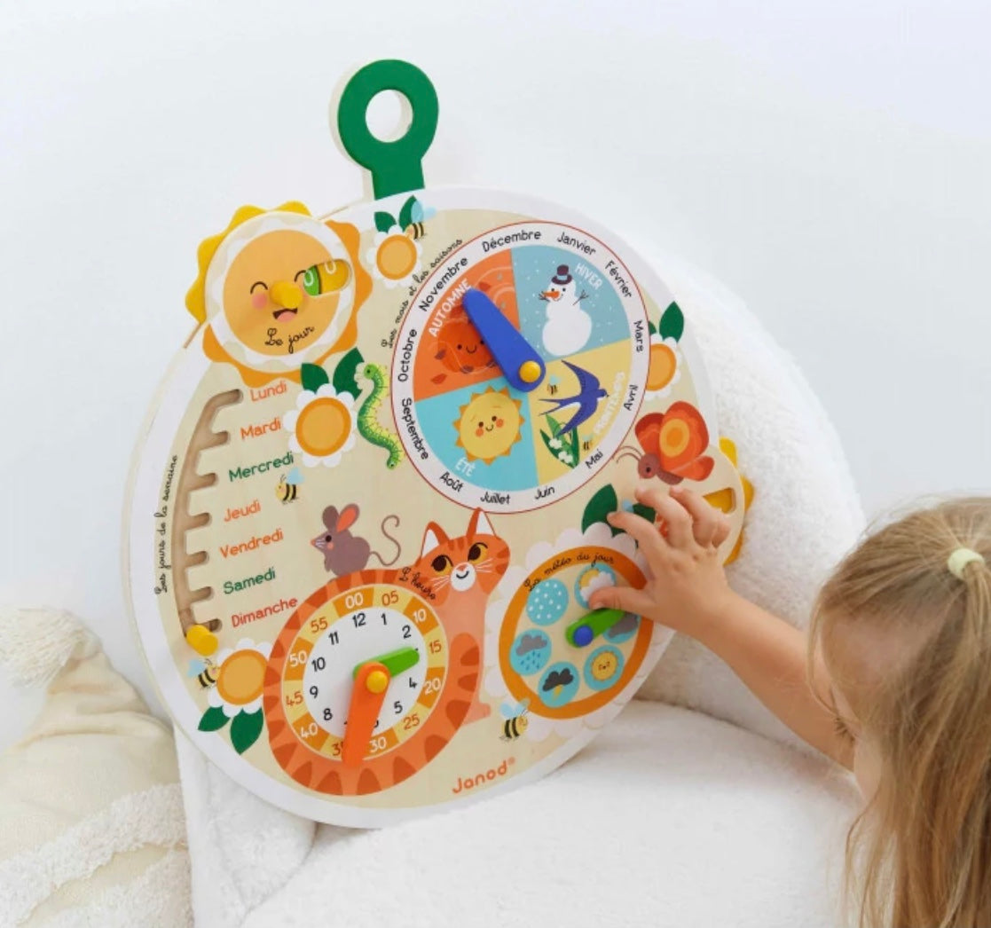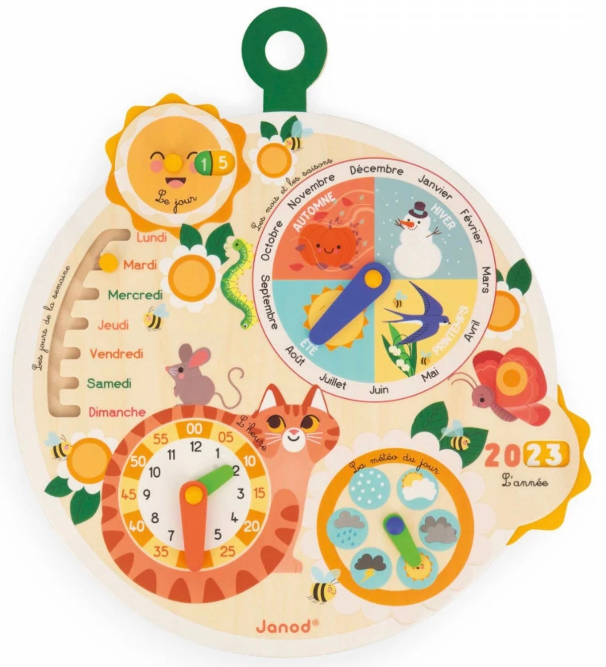 Quel jour sommes-nous ? Pourquoi dois-je porter un pull aujourd'hui ? Tant de questions pour les petits qui ont du mal à se repérer dans le temps et les saisons ! Véritable calendrier pour enfant, cette roue du temps est l'outil pédagogique idéal pour aider les bambins dès 3 ans à mieux comprendre le temps qui passe. Cet agenda en bois s'accroche aisément au mur, pour accompagner les enfants dans leurs rituels au quotidien. On commence par l'année : on fait tourner la petite roue sur la droite pour afficher le bon chiffre. Pratique, elle est double-face et permet de suivre l'enfant sur 10 années (5 ans sur chaque face) ! C'est au tour des saisons : grâce au cadran illustré, les enfants sont guidés par les illustrations et indiquent le bon mois. Ensuite, place aux jours de la semaine : on déplace le curseur de haut en bas et du lundi au dimanche, puis on fait tourner le soleil pour afficher la date du jour. Trop facile ! Place à la météo : on jette un œil par la fenêtre et on place l'aiguille sur le dessin correspondant. Idéal pour les enfants qui apprennent à s'habiller seuls ! Pour aller plus loin, on peut même indiquer l'heure sur le dos d'un adorable chat roux. Les aiguilles sont de 2 couleurs distinctes pour différencier les heures des minutes, pratique quand on commence à apprendre à lire l'heure ! Ce calendrier en bois joliment décoré avec des éléments naturels et de petits animaux se fond à merveille dans une chambre d'enfant. Il laisse apparaître du bois naturel, certifié FSC®. Petites abeilles et autres papillons accompagnent les enfants en maternelle qui peuvent reproduire les rituels en place à l'école. Cette roue du temps est aussi un jouet éducatif pour les plus grands qui apprennent à lire. Elle est disponible en français uniquement.