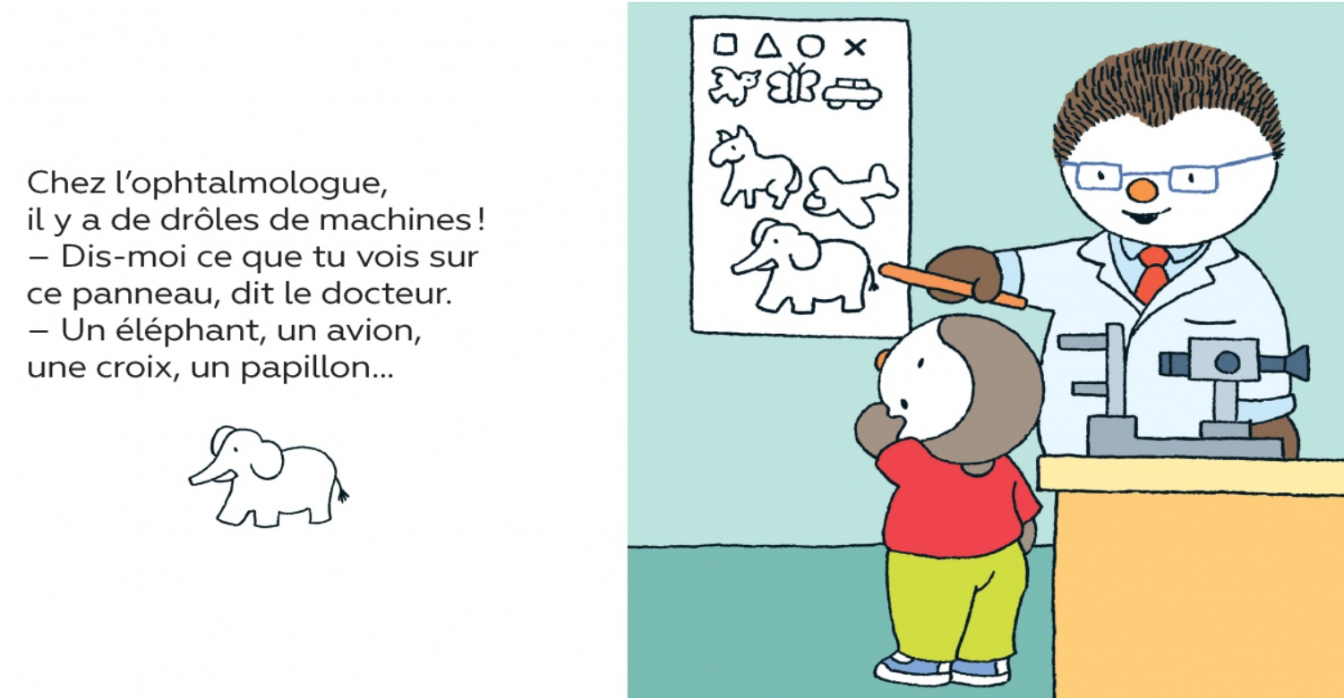 Résumé de l'histoire : Papa remarque que T’choupi se rapproche beaucoup de son livre pour voir les images. Alors, il l’emmène chez l’ophtalmologue, qui annonce à T’choupi qu’il devra porter des lunettes en classe. T’choupi et papa vont ensuite chez l’opticien choisir de belles lunettes bleues. Mais le lendemain, quand il doit les porter en classe, T’choupi est un peu intimidé… Pourtant, il va vite les adorer, et ne plus vouloir les quitter!