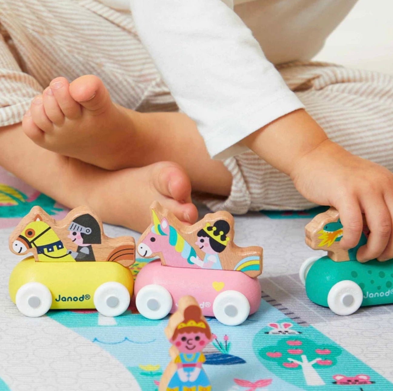 « Au galop, direction : le grand tournoi de chevaliers ! » Cette petite voiture en bois convient aux enfants, dès l’âge de 12 mois. Avec son cheval roulant, le preux chevalier file à l’entraînement comme à l’assaut des monstres ! Sa forme a été pensée spécialement pour une prise en main optimale pour les petits, qui peuvent facilement le tenir par le haut pour le faire rouler. Les véhicules sont parfaits pour inventer de nombreuses histoires et développer son imagination ! Les bébés s’amusent d’abord à les faire rouler, puis les plus grands se racontent toutes sortes d’aventures et développent leur vocabulaire et leur créativité. Cette petite voiture Janod est issue de notre collection Cross Roads : une série de tapis de jeu avec circuits, encore plus ludiques quand ils sont complétés par nos sets de cubes et nos petits véhicules en bois. La voiture chevalier convient particulièrement au tapis de jeu Royaume Enchanté, mais s’associe tout aussi bien avec d’autres tapis de la gamme. Elle est composée de bois issu de forêts gérées durablement, certifié FSC™. « Vite, rattrapons cette licorne sauvage ! »