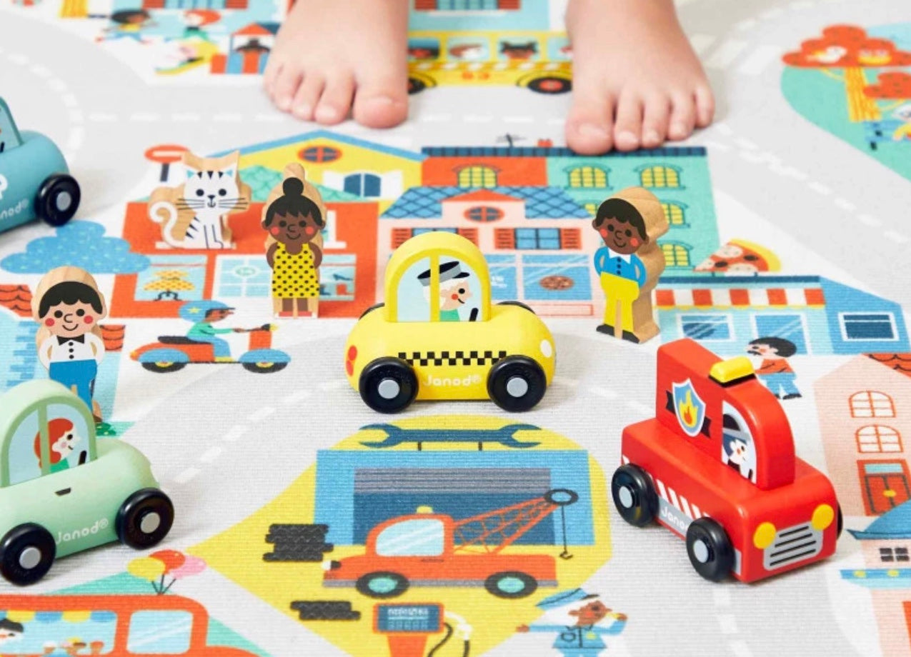 « En route pour le supermarché ! » Cette petite voiture en bois convient aux enfants, dès l’âge de 12 mois. Dans son joli coloris vert, voilà une berline compacte, idéale pour circuler en ville sans encombre ! Sa forme a été pensée spécialement pour une prise en main optimale pour les petits, qui peuvent facilement la tenir par le haut pour la faire rouler. Les véhicules sont parfaits pour inventer de nombreuses histoires et développer son imagination ! Les bébés s’amusent d’abord à les faire rouler, puis les plus grands se racontent toutes sortes d’aventures et développent leur vocabulaire et leur créativité. Cette petite voiture Janod est issue de notre collection Cross Roads : une série de tapis de jeu avec circuits, encore plus ludiques quand ils sont complétés par nos sets de cubes et nos petits véhicules en bois. La voiture verte convient particulièrement au tapis de jeu Ville, mais s’associe tout aussi bien avec d’autres tapis de la gamme. Elle est composée de bois issu de forêts gérées durablement, certifié FSC™. « Et si on passait chez le fleuriste après les courses ? »